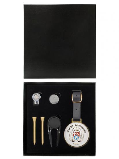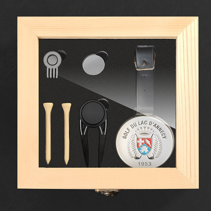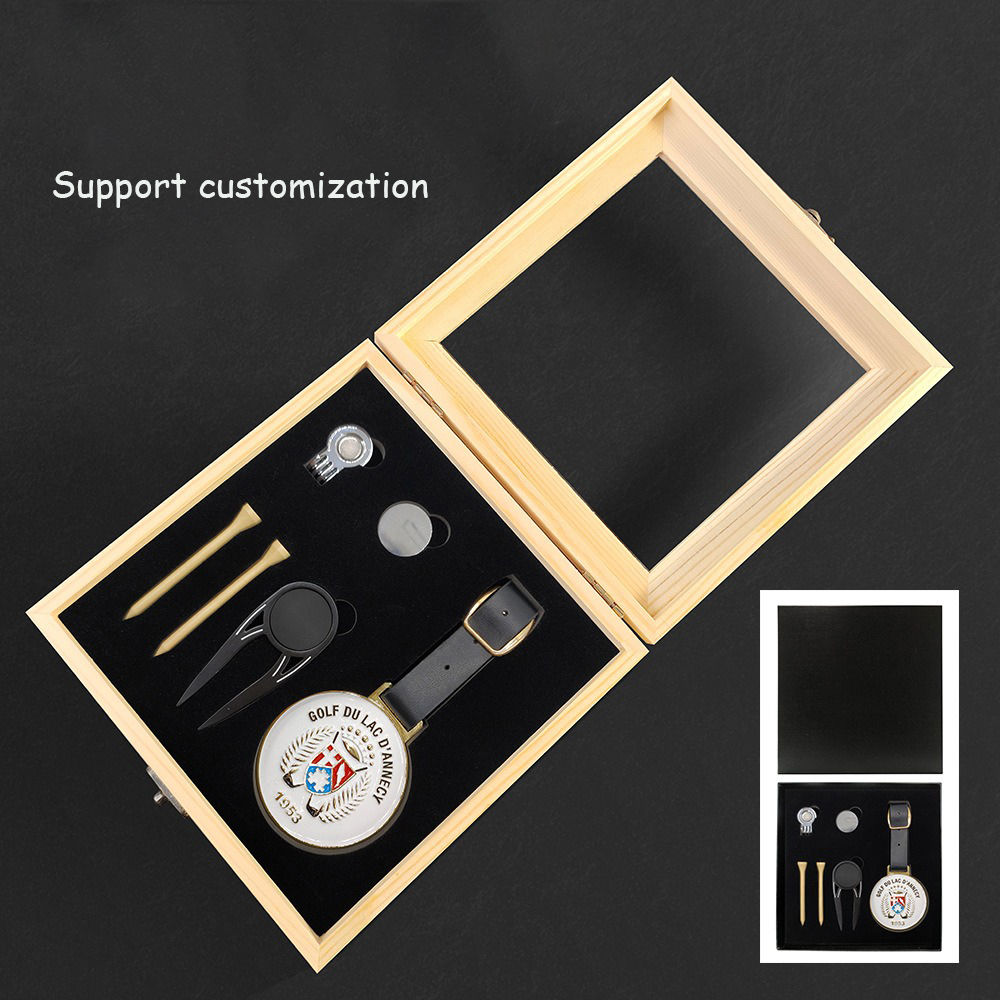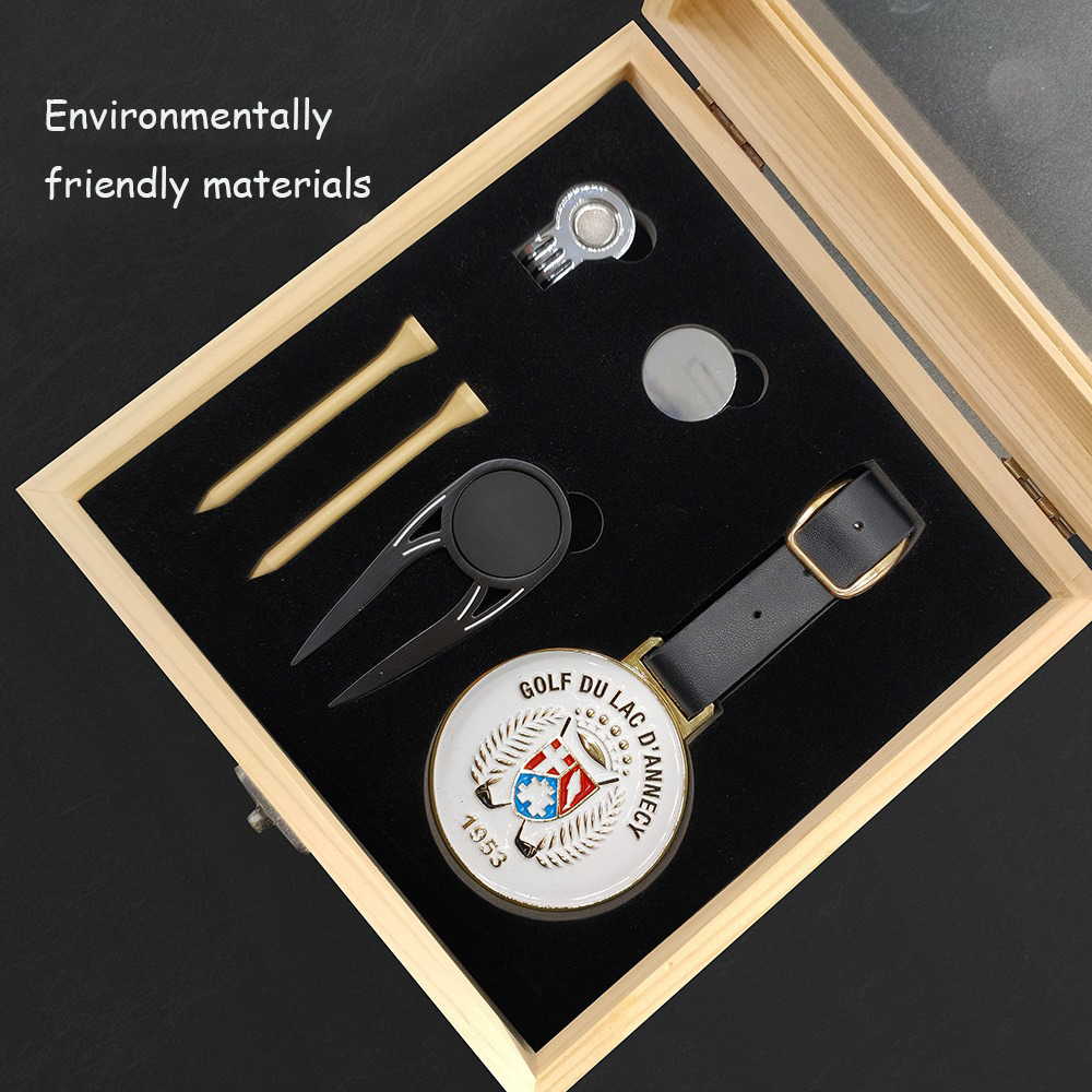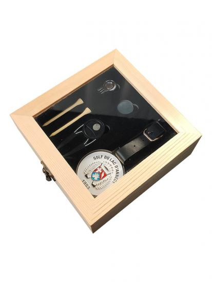 Set de regalo de golf Incluye marcador de bola, herramienta para reparar marcas de divot, tee y clip para la gorra en una caja de madera de haya de primera calidad (18 x 18 x 6,6 cm, 454 g) con forro de EVA. Colores personalizables (madera natural por defecto). Fabricado mediante fundición a presión, galvanoplastia, pintura y troquelado. Muestras/pedidos al por mayor: 7-15 días. Elegante y práctico para golfistas.