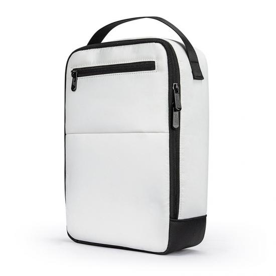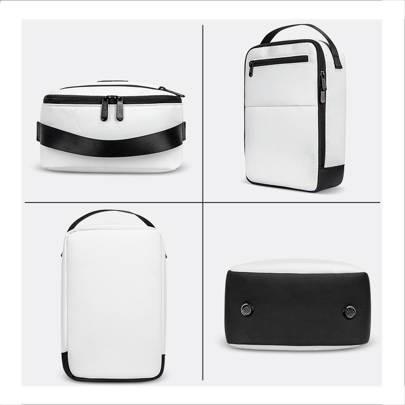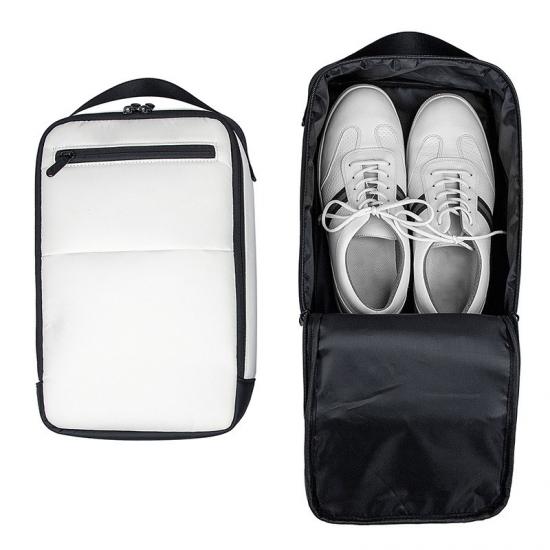 Bolsa unisex para zapatos de golf en blanco y negro, diseñada para facilitar su almacenamiento y transporte. Ligera, resistente y con asa práctica. Capacidad para un par de zapatos, ideal para viajes y escapadas de golf. Compacta, elegante y funcional.