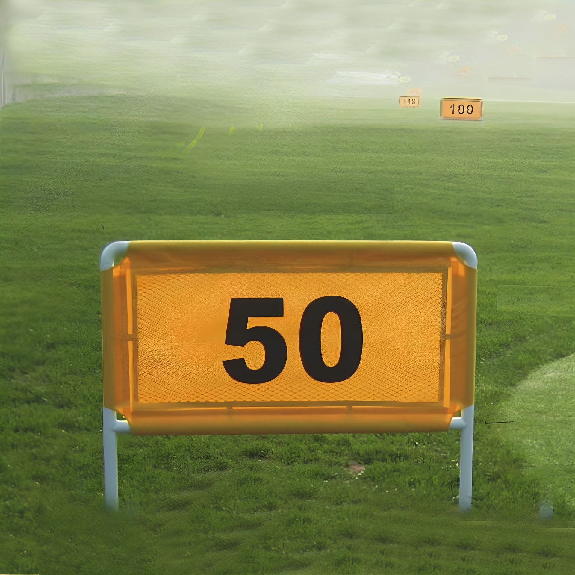 Estructura robusta de acero (tubo de acero) con letrero de lona resistente. Indica la distancia en yardas/metros. Resistente a la intemperie y fácil de instalar. Ideal para campos de prácticas de golf. Tamaño: personalizable. Material: Acero + Lona.