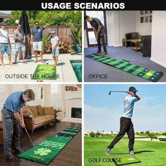 Esta alfombrilla de putting para interiores está diseñada para que golfistas de todos los niveles practiquen de forma constante en casa o en la oficina. Cuenta con una superficie de césped realista que reproduce el rodamiento natural del green e incluye marcadores de distancia para un entrenamiento de precisión.