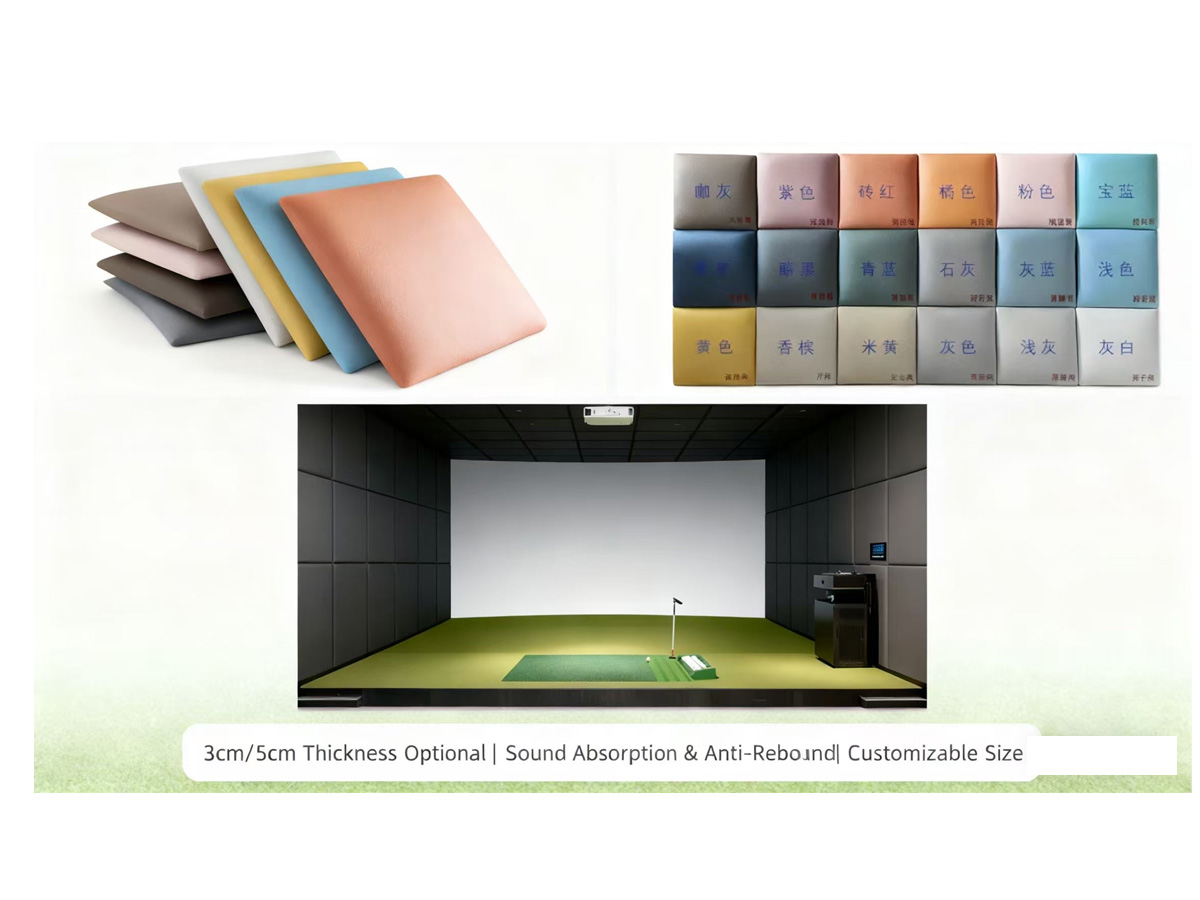 Diseñados para simuladores de golf de interior, nuestros paneles/cojines de pared ofrecen protección de nivel profesional, amortiguación del sonido y una estética personalizable, concebidos para transformar su espacio en un entorno de práctica seguro, silencioso y visualmente coherente.